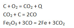 Полученное в результате реакции железо каплями стекает по раскаленному коксу вниз, насыщаясь углеродом, в результате чего получается сплав, содержащий 2,14 – 6,67 % углерода (чугун). Кроме углерода в него входят небольшая доля кремния и марганца. В количестве десятых долей процента в состав чугуна входят также вредные примеси — сера и фосфор. Кроме чугуна в горне образуется и накапливается шлак, в котором собираются все вредные примеси.