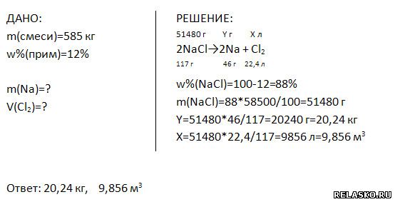 4. Рассчитайте массу натрия и объём хлора, полученных в результате электролиза 585 кг хлорида натрия, содержащего 12% примесей.