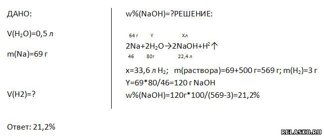 5. Какой объём займёт водород, выделившейся при растворении в 0,5 л воды 69 г натрия? Какова массовая доля щёлочи в полученном растворе?