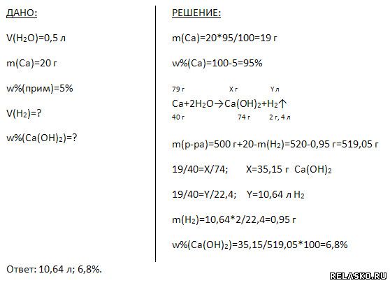 5. Какой объём водорода образуется при взаимодействии с 0,5 л воды 20 г кальция, содержащего 5% примесей? Рассчитайте массовую долю щёлочи в полученном растворе.