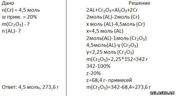 6. Вычислите, какое количество граммов оксида хрома (III), содержащего 20% примесей, и моль алюминия необходимо для получения 4,5 моль хрома с помощью алюминотермии.