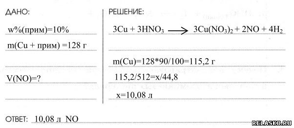 Найти объём NO, который получили из меди и разбавленной HNO3, если медь содержит 10% примесей CuO, a m(Cu прим)=128 г.