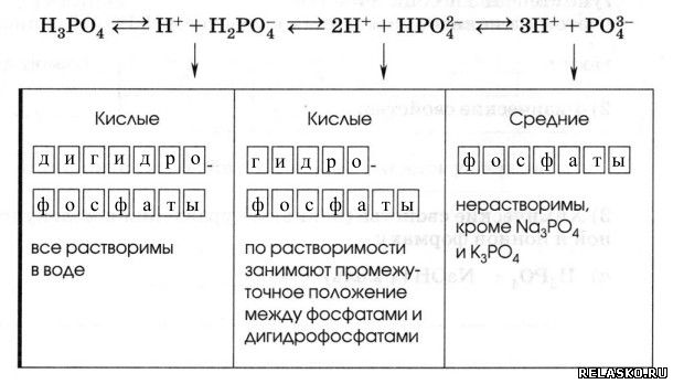 Как трёхосновная, H3PO4 диссоциирует ступенчато в три стадии, поэтому образует три ряда солей.
