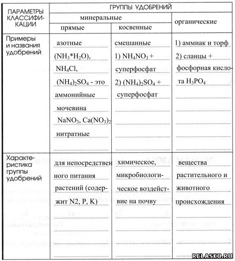 5. Предложите классификацию азотных удобрений (используйте приложение к учебнику или найдите необходимую информацию с помощью Интернета). Дайте краткую характеристику каждой группы удобрений, заполнив таблицу «Классификация удобрений».