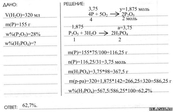6. В 320 мл воды растворили оксид фосфора (V), полученный в результате сжигания 155 г фосфора, содержащего 25% оксида фосфора (V) в виде примесей. Найдите массовую долю фосфорной кислоты в полученном растворе.