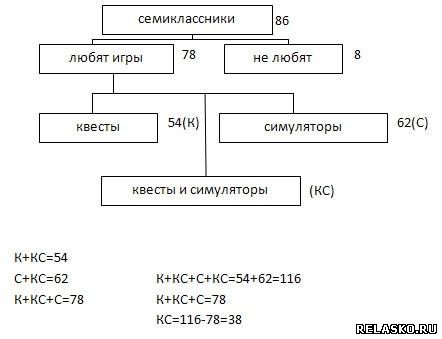 В летнем лагере отдыха 86 семиклассников. 8 из них не любят компьютерные игры. 54 семиклассника предпочитают квесты, 62 – симуляторы. Сколько ребят с одинаковым удовольствием играют и в квесты, и в симуляторы?