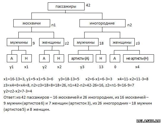 В салоне небольшого самолёта летят 42 пассажира. Некоторые из них москвичи, остальные – иногородние. Среди москвичей 9 мужчин. Некоторые из пассажиров артисты, но ни одна из иногородних женщин не является артисткой. Всего иногородних мужчин 18. Из них 13 – не артисты. Среди пассажиров, не являющихся артистами, 16 мужчин и 11 женщин. 6 москвичей не артисты. Разберитесь, пожалуйста, с пассажирами: кто есть кто?