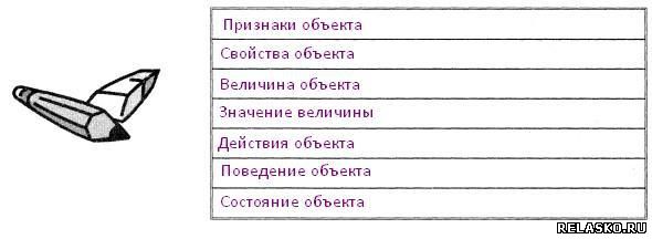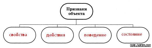 а) Под признаками объекта мы будем понимать его свойства, действия, поведение, состояние. б) Свойства объекта отвечает на вопросы: «Чем может отличаться данный объект от другого?», «Что может измениться у объекта при выполнении действия?» в) Действия объекта отвечает на вопросы: «Что он может делать?» (активное действие), «Что с ним можно делать?» (пассивное действие). г) Поведение объекта это пошаговое описание каждого действия, соответственного этому объекту. д) Состояние объекта определённое сочетание значений всех или некоторых свойств этого объекта.