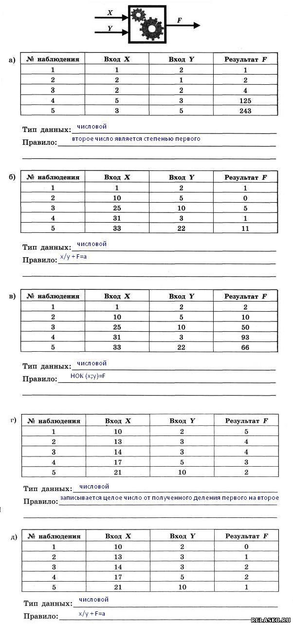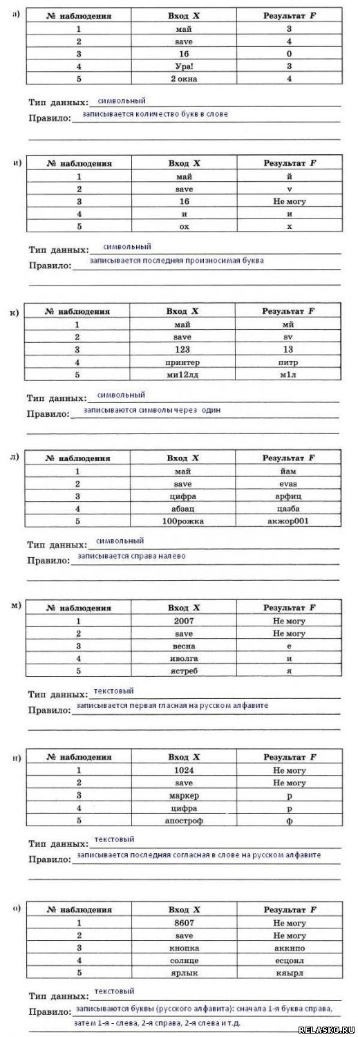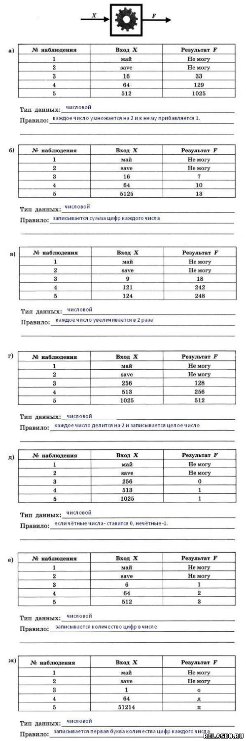 43. Автоматическое устройство имеет один вход, можно подавать на него натуральные числа или последовательности символов и наблюдать результат на выходе. По таблице наблюдений определите тип входных данных и правило, по которому осуществляется их преобразование.
