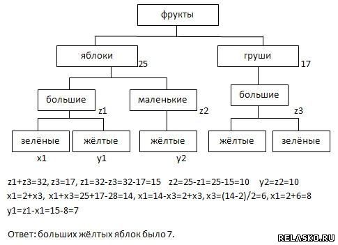 Бабушка прислала Ивану посылку с яблоками и грушами. Некоторые из этих плодов были большими, остальные – маленькими. По цвету плоды тоже различались: часть плодов была жёлтого цвета, остальные – зелёного. Среди плодов не было ни маленьких груш, ни маленьких зелёных яблок. Яблок было 25, а груш – 17. Больших плодов было 32. Жёлтых плодов было 28. Зелёных яблок было на 2 больше, чем зелёных груш. Иван угостил этими плодами своих друзей. Больше всего ребятам понравились большие жёлтые яблоки. Сколько было таких яблок?