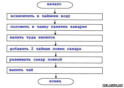 26. Пете захотелось чаю. Он вскипятил в чайнике воду, положил в чашку пакетик заварки, налил туда кипяток, добавил две чайные ложки сахара, размешал их ложкой и с удовольствием выпил свой чай. Оформите алгоритм действий Пети в виде блок-схемы.