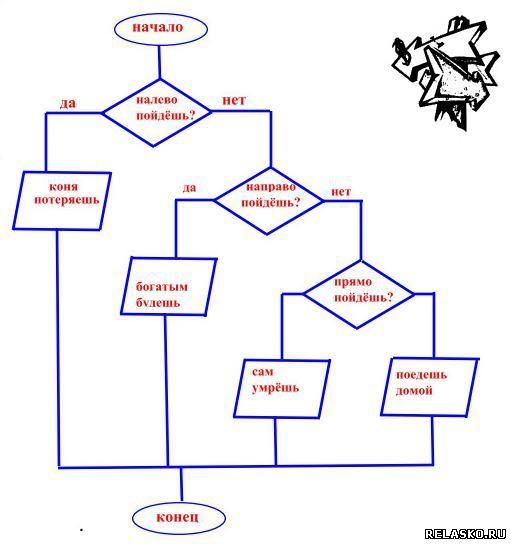 39. Вспомните русскую народную сказку «Иван-царевич и Серый Волк». Составьте блок-схему для выбора маршрута по надписям на придорожном камне. По какой ветви пошел Иван-царевич?