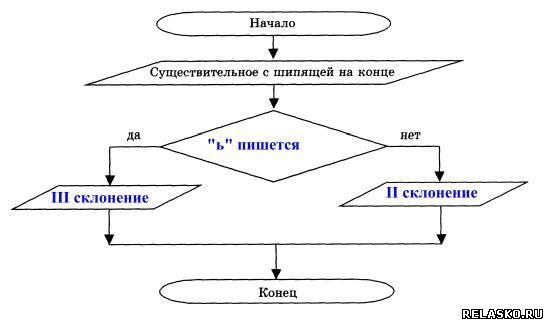 37. На конце существительных III склонения после шипящих в формах именительного и винительного падежей пишется «ь». В конце существительных II склонения после шипящих «ь» не пишется. Оформите это правило в виде блок-схемы