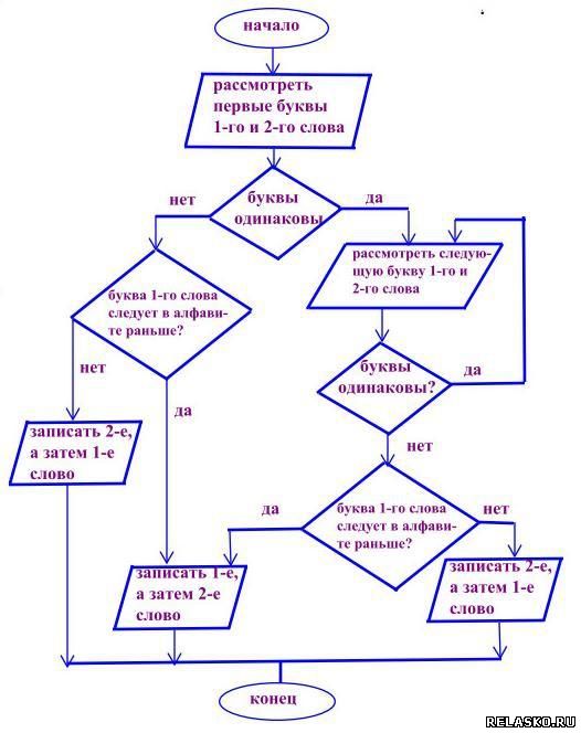 50. Представьте в виде блок-схемы алгоритм, по которому определяется, какое из двух слов должно стоять в словаре раньше, а какое позже, если словарь упорядочивается в лексикографическом порядке.