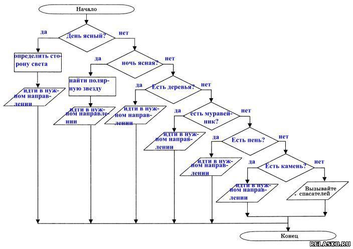 Оформите данный алгоритм ориентирования на местности в виде блок-схемы.