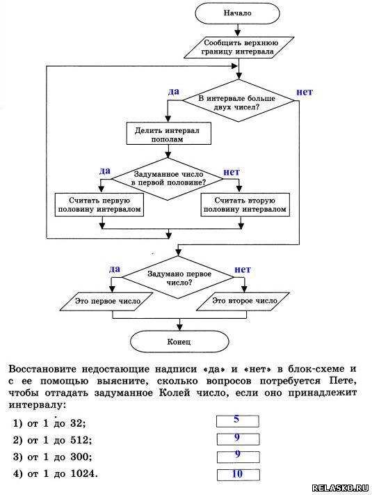49. Коля предложил Пете более сложную игру, чем изложенная в задании 40. Коля задумывает натуральное число из интервала от 1 до N. Петя должен это число отгадать. Он может задавать Коле вопросы, допускающие только ответы «да» или «нет». Петя разработал алгоритм, позволяющий за наименьшее число вопросов отгадать число, задуманное Колей.
