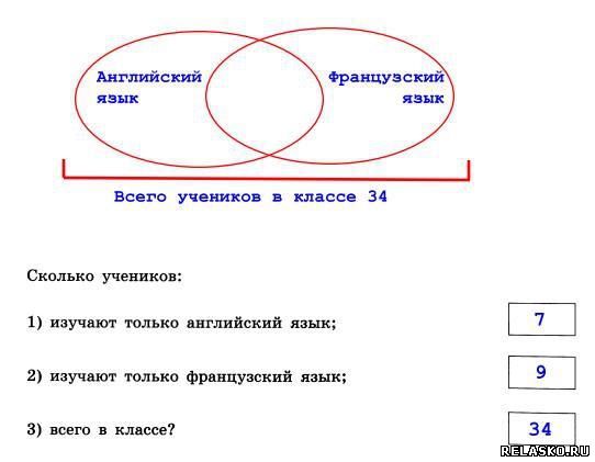 31. Каждый ученик в классе изучает по крайней мере один из двух языков: английский или французский. Английский язык изучают 25 человек, французский — 27 человек, оба языка — 18 человек. Изобразите это схематически и ответьте на вопросы.