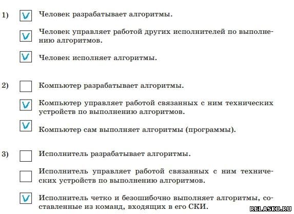 1) Алгоритм — это конечная последовательность шагов в решении задачи, приводящая от исходных данных к требуемому результату. 2) Разрабатывать алгоритмы может только человек. 3) Исполняют алгоритмы люди и всевозможные устройства – компьютеры, роботы, станки, спутники, бытовая техника.