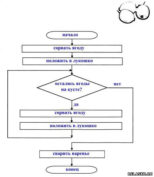 46. Однажды бабушка попросила Машу помочь собрать ягоды крыжовника. Девочка взяла лукошко и подошла к большому колючему кусту. Она осторожно срывала ягоду и опускала ее в лукошко. Так Маша делала до тех пор, пока на кусте не осталось ни одной ягоды. Из этих ягод сварили очень вкусное варенье. Запишите действия Маши в виде блок-схемы.