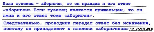 38. На острове живут два племени: аборигены и пришельцы. Аборигены всегда говорят правду, а пришельцы всегда врут. Путешественник, приехавший на остров, нанял жителя острова в проводники. Они пошли и увидели другого жителя острова. Путешественник послал проводника узнать, к какому племени принадлежит этот человек. Проводник вернулся и сказал, что житель говорит, что он абориген. Кем был проводник: пришельцем или аборигеном?