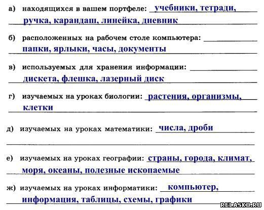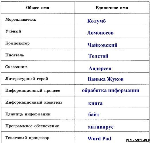 3. Вспомните по одному объекту каждого из приведённых множеств и запишите их единичные имена.
