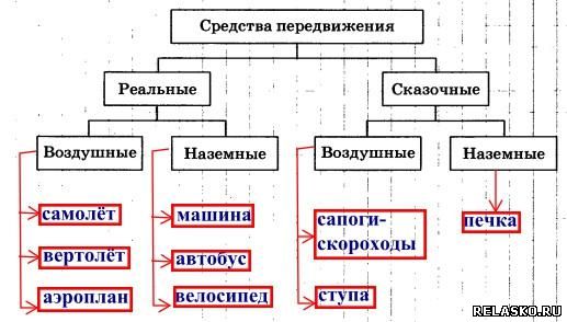 54. Дополните классификацию средств передвижения, используемых в реальной жизни и встречающихся в сказках.