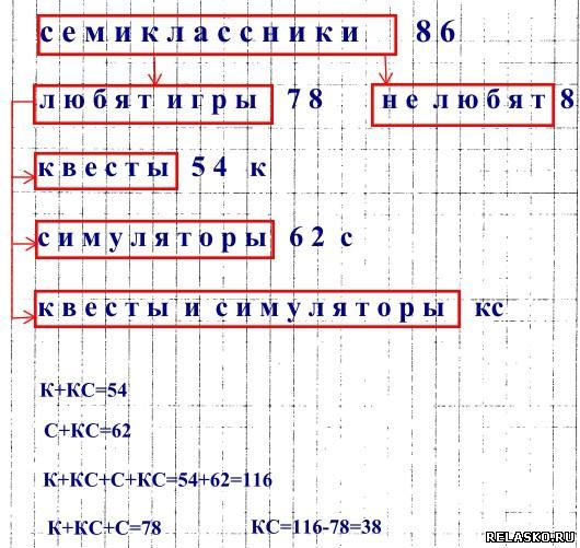В летнем лагере отдыха 86 семиклассников. 8 из них не любят играть в компьютерные игры. 54 семиклассника предпочитают квесты, 62 – симуляторы. Сколько ребят с одинаковым удовольствием играют и в квесты, и в симуляторы?