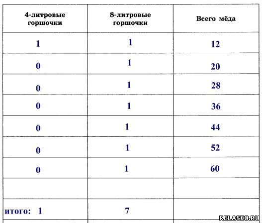 Винни-Пух разлил 60 л мёда в 9 горшочков двух видов – вместимостью 4 и 8 л. Сколько горшочков каждого вида занял Винни-Пух?