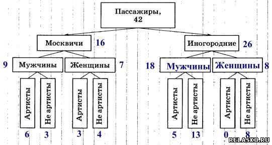 В салоне небольшого самолёта летят 42 пассажира. Некоторые из них москвичи, остальные иногородние. Среди москвичей 9 мужчин. Некоторые из пассажиров артисты, но ни одна из иногородних женщин не является артисткой. Всего иногородних мужчин 18. Из них 13 – не артисты. Среди пассажиров, не являющихся артистами, 16 мужчин и 11 женщин. 6 москвичей не артисты.