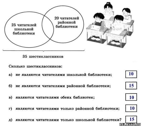37. Каждый из 35 шестиклассников является читателем по крайней мере одной из двух библиотек: школьной и районной. Из них 25 человек берут книги в школьной библиотеке, 20 – в районной.