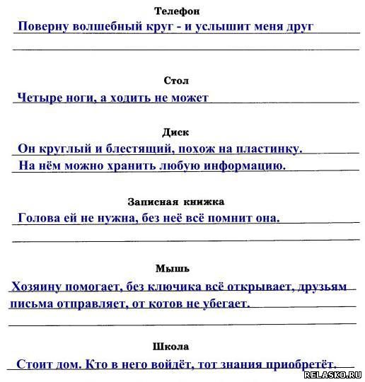 86. Как правило, в загадке в замысловатой форме даётся описание существенных признаков некоторого предмета. На основании этой информации требуется догадаться, о каком предмете идёт речь. Придумайте сами загадки для понятий «телефон», «стол», «диск», «записная книжка», «мышь», «школа».