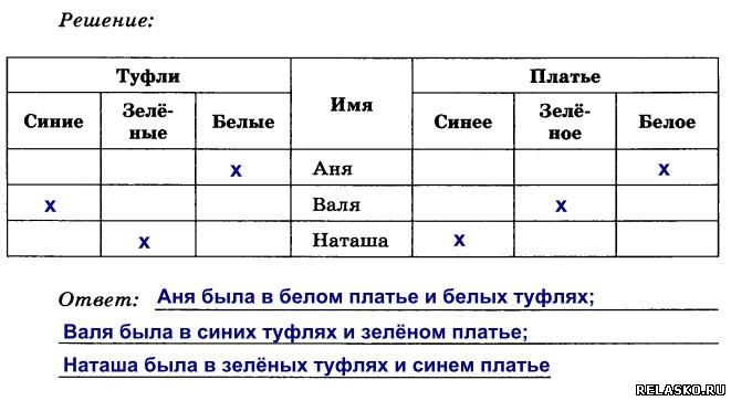 129. Три подруги вышли на прогулку в туфлях и платьях белого, зелёного и синего цветов. Известно, что только у Ани цвета платья и туфель совпадали. Ни туфли, ни платье Вали не были белыми. Наташа была в зелёных туфлях. Определите цвет платья и туфель на каждой из подруг.