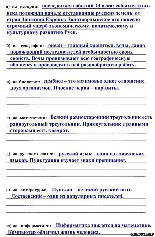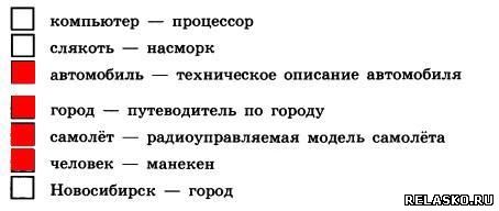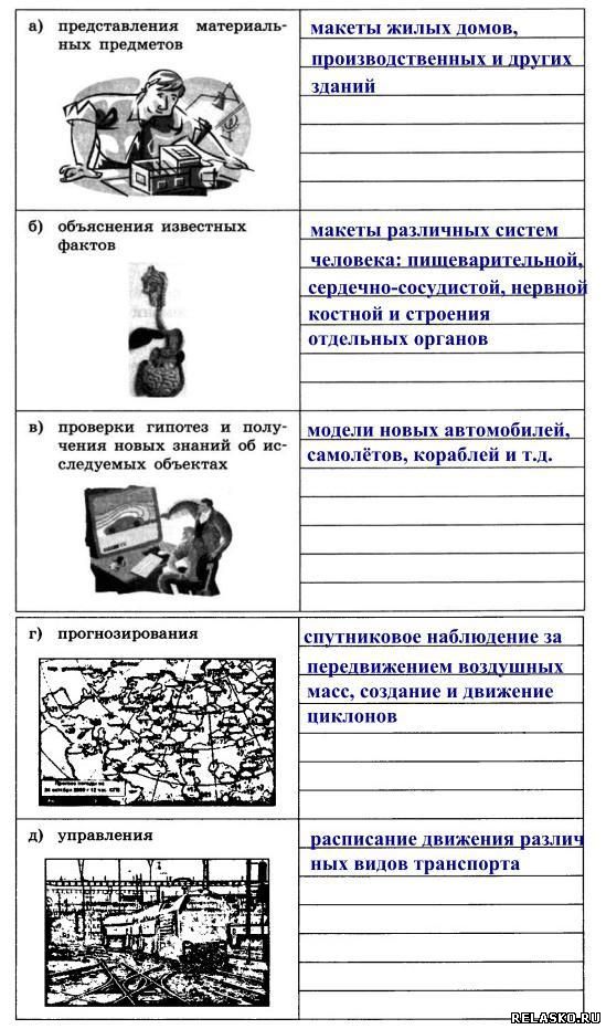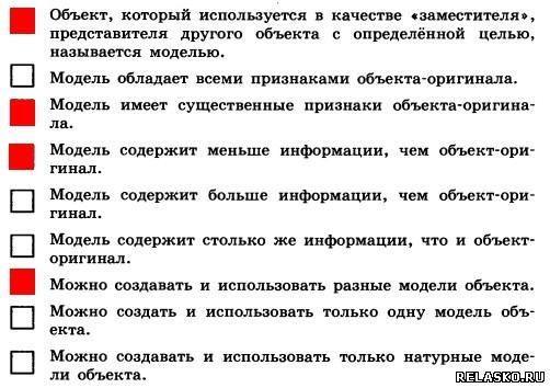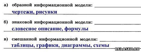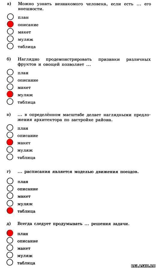 Задания к главе 10 «Знаковые информационные модели» Что бы посмотреть решение и правильный ответ на задания из рабочей тетради по Информатике Босова нажмите на картинку 113. Воспользуйтесь учебником истории и приведите пример словесной модели исторического события. Последствия событий 13 века: события этого века положили начало отстаиванию русских земель от стран Западной Европы; Золотоордынское иго нанесло огромный ущерб экономическому, политическому и культурному развитию Руси. 114. Воспользуйтесь учебником географии и приведите пример словесной модели географического объекта или природного процесса. Океан – главный хранитель воды, давно поражающий исследователей необычностью своих свойств. Воды пронизывают всю географическую оболочку и производят в ней разнообразную работу. 115. Воспользуйтесь учебником биологии и приведите пример словесной модели объекта растительного или животного мира. Симбиоз – это взаимовыгодное отношение двух организмов. 116. Приведите примеры: 117. а) Модель каких отношений между людьми построена в басне И. А. Крылова «Волк и ягнёнок»? Приведите строки басни, подтверждающие вашу мысль. Перед нами пример авторитарного стиля отношений. С одной стороны, волк как олицетворение силы и, с другой стороны, ягнёнок – слабости. Строки «Ягнёнка видит он, на добычу стремится» и «у сильного всегда бессильный виноват» подтверждают наши размышления. б) Модели каких характеров людей построены в басне И. А. Крылова «Стрекоза и муравей»? Приведите строки басни, подтверждающие вашу мысль. Противопоставляется модель беспечного типа характера (стрекоза) и трудолюбивого (муравей). Строки «кто зимой быть сытым хочет, тот о том с весны хлопочет» и «ты все пела? Это дело: так иди же попляши!»