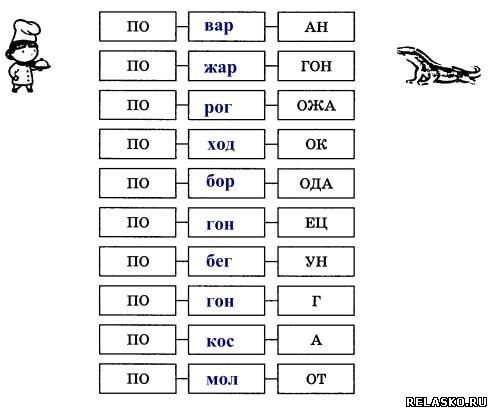 94. Из слов «бобр», «кос», «гон», «ход», «рог», «бег», «мол», «вар», «жар» подберите такой, чтобы он был последним слогом для первого слова и первым – для второго (запишите слоги в скобках).