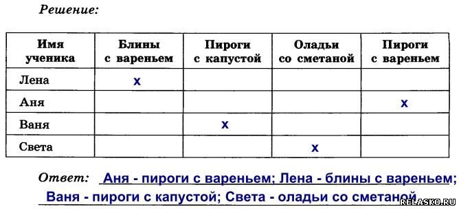 127. На завтрак в школьной столовой приготовили блины с вареньем, пироги с капустой, оладьи со сметаной и пироги с вареньем. Лена, Аня, Ваня и Света выбрали разные блюда. Определите, какое блюдо выбрал каждый из ребят, если известно, что Лена и Аня – сладкоежки, а Ваня и Аня больше всего любят пироги.