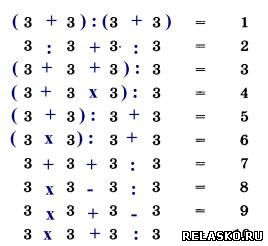 92. Используя знаки арифметических действий и, если надо, скобки, запишите числа от 1 до 10 с помощью четырёх троек.
