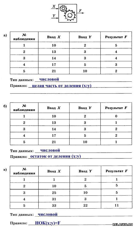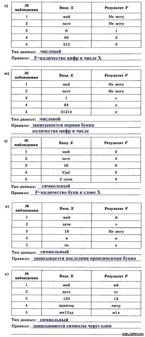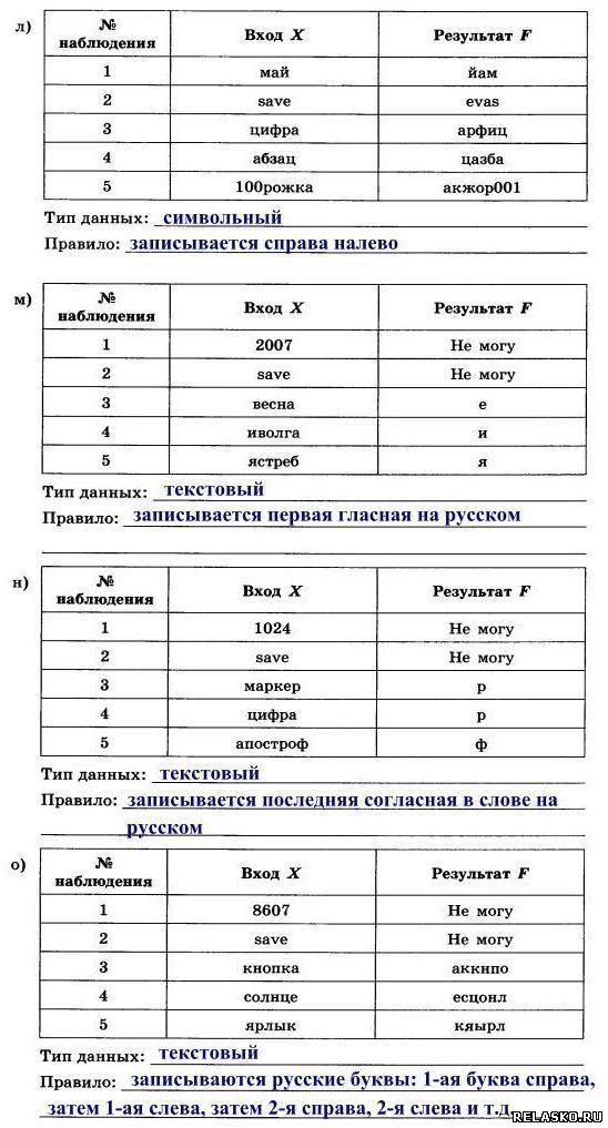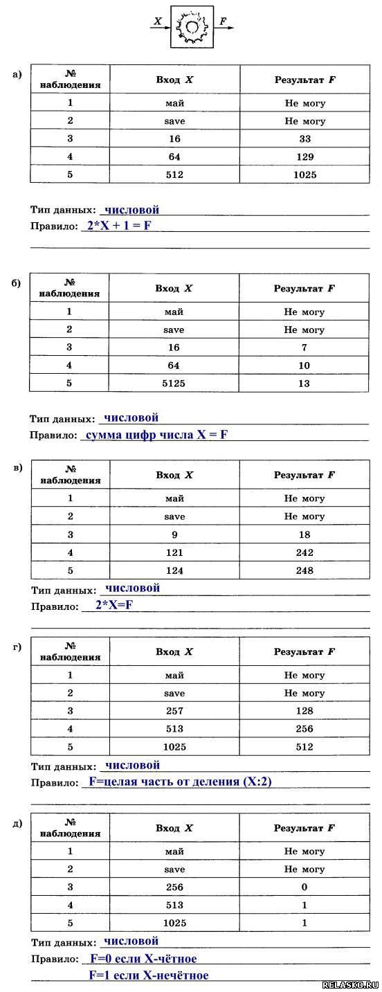 65. Автоматическое устройство имеет один вход. Можно подавать на него натуральные числа или последовательности символов и наблюдать результат на выходе. По таблице наблюдений определите тип входных данных и правило, по которому осуществляется их преобразование.