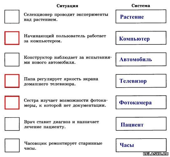 64. В каждой системе протекают некоторые внутренние процессы, которые могут бытьизвестны или неизвестны человеку. Человек может не знать, как «внутри» устроена система, но понимать, к каким результатам на выходе приведут определённые воздействия на входе. В таких случаях говорят, что система рассматривается как «чёрный ящик». Для каждой ситуации укажите систему, о которой в ней идёт речь. Отметьте ситуации, в которых системы могут восприниматься как «чёрный ящик».