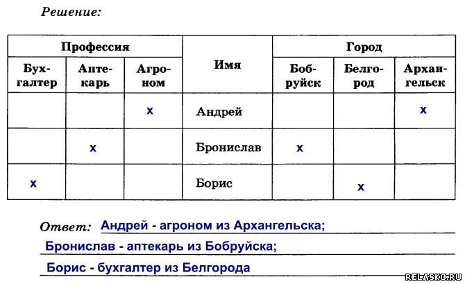 130. Три молодых человека — Андрей, Бронислав и Борис. Один из них — аптекарь, другой — бухгалтер, третий — агроном. Один живёт в Бобруйске, другой — в Архангельске, третий — в Белгороде. Требуется выяснить, кто где живёт и у кого какая профессия. Известно лишь, что: