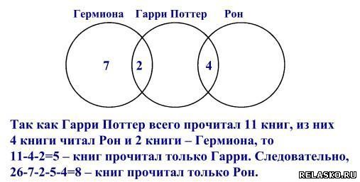 83. На полке стояли 25 волшебных книг по заклинаниям, все они были прочитаны Гермионой, Гарри Поттером или Роном. При этом не было ни одной книги, которую бы прочитали все. 4 книги прочитали и Гарри Поттер, и Рон. Гермиона прочитала 7 книг, которых не читали ни Гарри Поттер, ни Рон, и две книги, которые читал Гарри Поттер. Всего Гарри Поттер прочитал 11 книг. Сколько книг прочитал только Рон?
