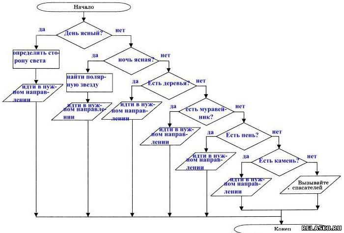 Оформите данный алгоритм ориентирования на местности в виде блок-схемы.