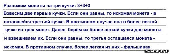 200. Имеется 9 монет, среди которых одна фальшивая (легче других). Придумайте способ нахождения фальшивой монеты за минимальное число взвешиваний на чашечных весах без гирь. Запишите свои рассуждения, используя связку «если ..., то ...».
