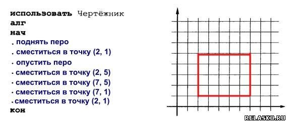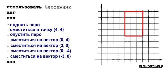 213. Составьте алгоритм управления Чертёжником, в результате выполнения которого на координатной плоскости будет нарисован прямоугольник, длины сторон которого равны 3 и 4 единицам.