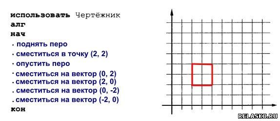 212. Составьте алгоритм управления Чертёжником, в результате выполнения которого на координатной плоскости будет нарисован квадрат, длина стороны которого равна 2 единицам.