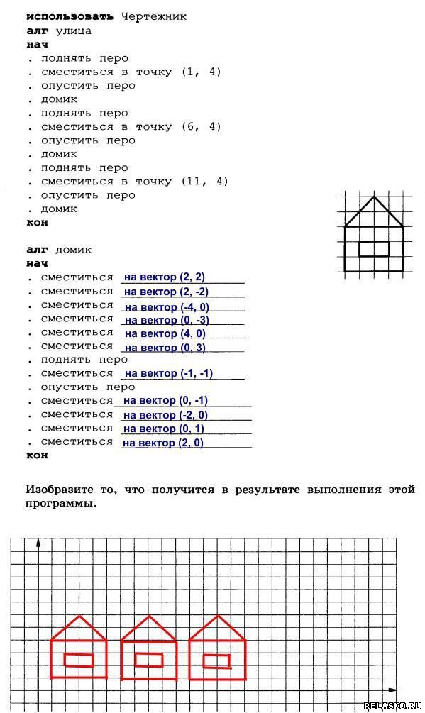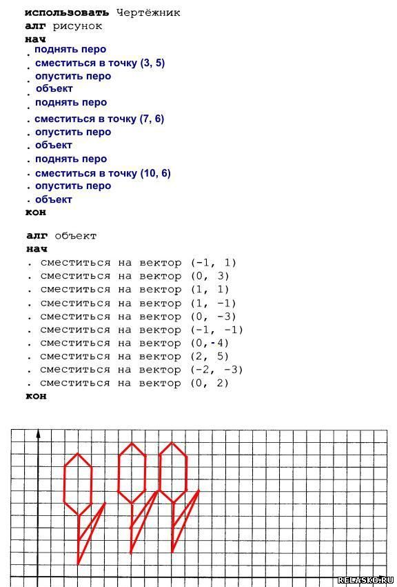 218. Выясните, какой объект изображается с помощью вспомогательного алгоритма. Внесите необходимые дополнения в основной алгоритм так, чтобы вспомогательный алгоритм был исполнен 3 раза. Выполнение вспомогательного алгоритма должно начинаться в точках с координатами (3, 5), (7, 6), (10, 6).