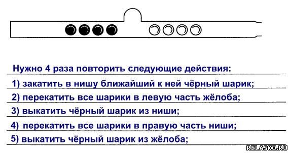 204. В узком и очень длинном жёлобе находятся 8 шариков, четыре чёрных слева и четыре белых чуть-чуть большего диаметра справа. В средней части жёлоба в стенке имеется небольшая ниша, в которой может поместиться один чёрный или один белый шарик. Два любых шарика могут расположиться рядом поперек жёлоба только в том месте, где находится ниша. Левый конец жёлоба закрыт, а в правом конце есть отверстие, через которое может пройти чёрный шарик, но не может пройти белый. Вынимать шарики из жёлоба не разрешается. Как выкатить из жёлоба все чёрные шарики?