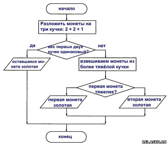 199. Кот Матроскин и пёс Шарик нашли клад, который состоял из 5 одинаковых монет. В коробке, в которой лежали монеты, друзья обнаружили записку: «При помощи чашечных весов без гирь найдите среди этих 5 монет одну золотую и купите почтальону Печкину велосипед. Сделайте это при помощи двух взвешиваний. Золотая монета более тяжёлая». Дядя Фёдор помог своим друзьям справиться с этим заданием. Как он действовал?