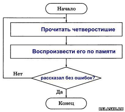 202. Руслан учит наизусть четверостишие, заданное по литературе. Он один раз прочитывает четверостишие и пытается воспроизвести его по памяти. Так он будет делать до тех пор, пока не расскажет четверостишие без единой ошибки. Запишите действия Руслана в виде блок-схемы.