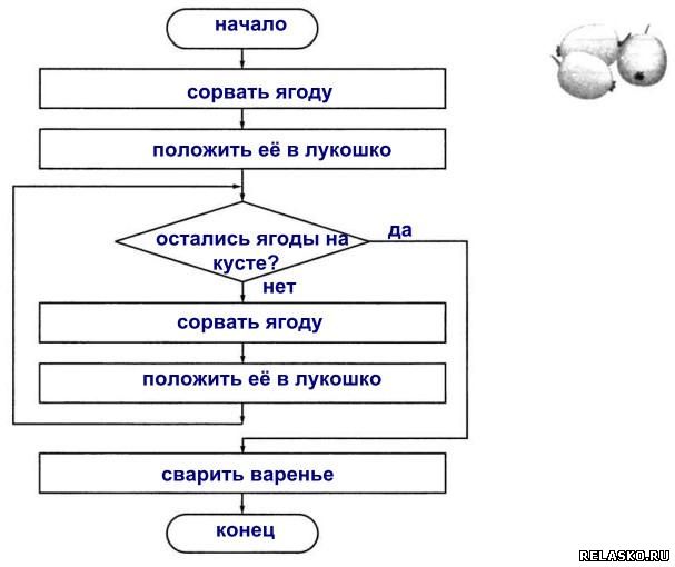 203. Однажды бабушка попросила Машу помочь собрать ягоды крыжовника. Девочка взяла лукошко и подошла к большому колючему кусту. Она осторожно срывала ягоду и опускала её в лукошко. Так Маша делала до тех пор, пока на кусте не осталось ни одной ягоды. Из этих ягод сварили очень вкусное варенье. Запишите действия Маши в виде блок-схемы.