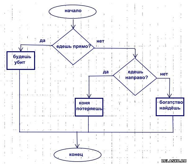 197. Вспомните русскую народную сказку «Иван Царевич и Серый Волк». Составьте блок-схему для выбора маршрута по надписям на придорожном камне. По какой ветви пошел Иван Царевич?